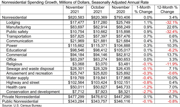 “If no news is good news, then this was a fine report,” said ABC Chief Economist Anirban Basu. “There is little in the data for November 2021 that was earth-shattering. It is interesting to note, however, that the streak of meaningful monthly increases in nonresidential construction spending effectively ended in November, strongly suggesting that supply chain issues and worker shortages continue to constrain the pace of recovery in nonresidential construction (the same issues that continue to suppress contractor margins, according to ABC’s Construction Confidence Index).
