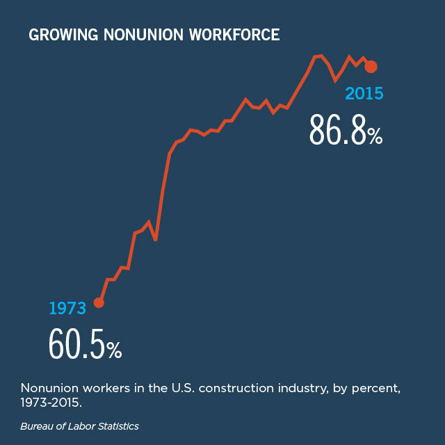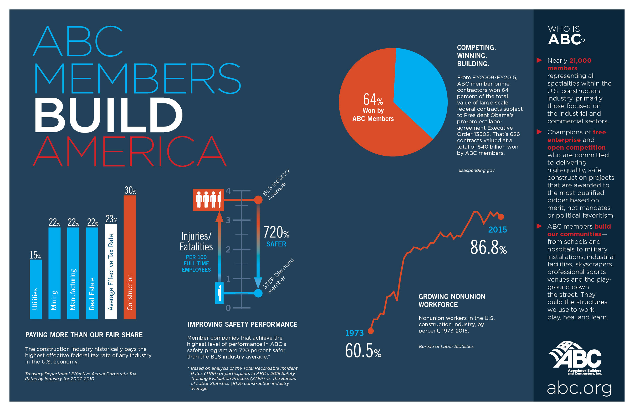 During ABC’s Legislative Week 2016, an ad entitled ABC Members Build America appeared in Politico, the “must read” daily with 30,000 subscribers whose readers include members of Congress, White House and legislative staffers, lobbyists, and everyone and anyone who follows what’s happening on Capitol Hill. The ad, as well as the charts featured within the ad, has been made available as marketing resources for ABC Members. Full Ad Growing Nonunion Workforce Chart ABC Members Winning Work ABC Improving Safety Performance Construction Industry Tax Rates