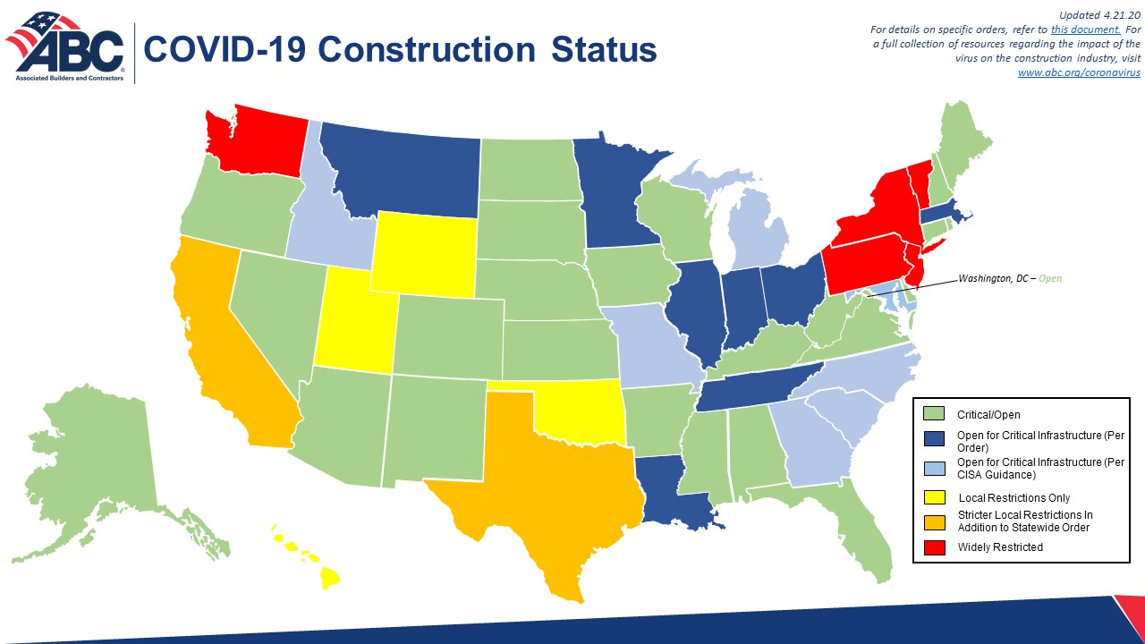 ABC continues to update its resource tracking state and local COVID-19 policies impacting the construction industry. If a new or amended state or local policy is issued in your chapter territory, please alert via email Brandon Ray, Nick Steingart and/or Ben Brubeck on ABC’s State Affairs team.