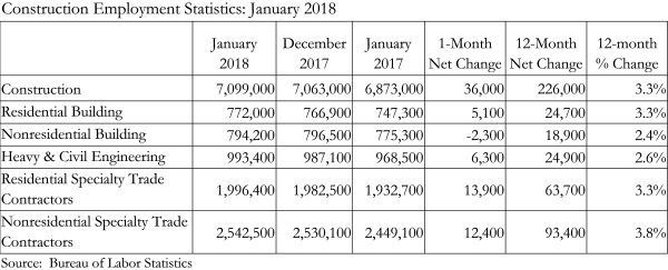 The unemployment report from the Bureau of Labor Statistics shows growth in both public and private construction spending, according to an analysis by ABC. Construction added 36,000 net new jobs in January, an impressive increase of 0.5 percent on a month-over-month basis. During the past 12 months, construction has added 226,000 net new jobs, which translates into 3.3 percent growth. The nation added 200,000 jobs across all non-farm segments in January, with construction comprising a strong 18 percent of that growth. Nonresidential construction added 16,400 net new positions in January, including substantial job growth in the heavy and civil engineering (6,300 jobs) and nonresidential specialty trade (12,400 net new positions) segments. The growth of staffing levels in heavy and civil engineering is indicative of rising public construction expenditures, while the growth in nonresidential specialty trade contractors appears to be more closely related to stronger private spending. At 7.3 percent, the construction unemployment rate is 2.1 percentage points lower than it was a year ago, consistent with the notion of expanding human capital shortfalls. The national unemployment rate remains at 4.1 percent for a fourth consecutive month. “Any lingering concerns regarding the labor market after December’s somewhat weak report should be completely dispelled by now,” said ABC Chief Economist Anirban Basu. “America’s economy is now firing on many cylinders due to a combination of solid consumer spending growth, accelerating business outlays and stronger exports. All of this ends up translating into demand for construction services, which remains on the rise and continues to trigger strong hiring. “While nonresidential net construction employment dipped by 2,300 positions in January, the segment has added nearly 19,000 jobs on a year-over-year basis. Other nonresidential construction segments, including heavy and civil engineering and specialty trade contractors, have added significantly to employment on both monthly and annual bases,” said Basu. “Given the elevated number of available construction job openings still in place, staffing levels are likely to grow in future months, though that growth will continue to be constrained by the paucity of available talent that has contractors scrambling. “While today’s employment report was upbeat, there are some growing concerns. The decline in nonresidential construction employment on a monthly basis may be indicative of overbuilding and market saturation in certain markets. Inflationary fears also are building, prompting interest rates to head higher and stock prices to become meaningfully more volatile. Both construction wages and materials prices have emerged as components of a broader inflation story. While the near-term economic outlook remains rosy given the economy’s abundant momentum, there are some grey clouds forming on the horizon of which contractors should be aware,” said Basu.