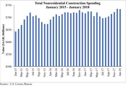 Nonresidential construction spending fell 0.1 percent on a monthly basis in January 2018, while year-over-year spending increased, according to an ABC analysis of U.S. Census Bureau data. Nonresidential January spending totaled $732.9 billion on a seasonally adjusted annual rate, adding up to a 2.4 percent increase year over year. Private nonresidential construction fell 1.5 percent for the month, while public sector nonresidential spending increased 1.9 percent. The largest year-over-year increases occurred in public safety (33.5 percent) and transportation (20.2 percent). “Today’s data indicates that nonresidential spending continues to expand erratically and unevenly,” said ABC’s Chief Economist Anirban Basu. “On a monthly basis, nonresidential construction spending declined in January. While the decline was minimal, and may have been primarily attributable to freezing temperatures in much of the country, there has been a long-lived pattern of occasional spending setbacks in the context of broader expansion cycles. The result of the most recent spending setback is that nonresidential construction outlays are only 2.4 percent above year-ago levels. “Interestingly, there is evidence of a reversal of fortune as spending picks up in certain public segments while flattening out in certain private ones,” said Basu. “With the housing market recovering, property tax and other forms of real estate tax collections have increased. This has positioned a growing number of public agencies to step up construction spending in education, public safety and other publicly financed categories. “Meanwhile, there are growing concerns regarding excess inventory of commercial and office space in certain metropolitan areas,” said Basu. “This may help explain recent construction spending setbacks in a variety of privately financed construction segments. That said, there is little reason to believe that private construction will falter in 2018. Economic growth, including job growth, remains robust. Confidence is surging among many economic actors, including bankers and developers. The combination of capital and confidence should be enough to drive spending growth in most private segments as 2018 progresses.”