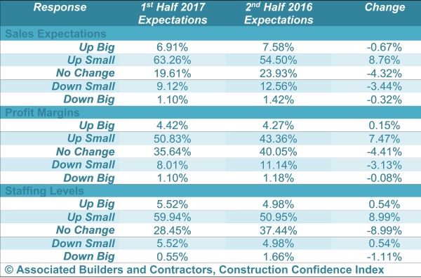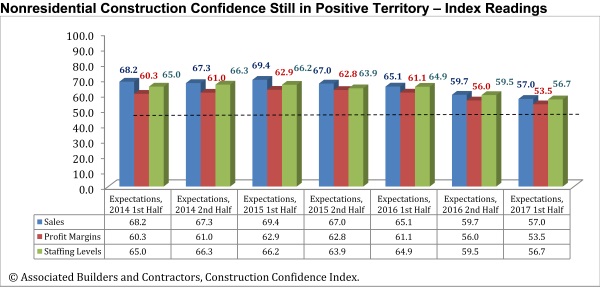 The majority of commercial and industrial contractors are confident about sales growth, profits and staffing levels heading into 2018, according to the latest Associated Builders and Contractors (ABC) Construction Confidence Index (CCI). Despite rising construction labor and materials costs, 55 percent of contractors expect their profit margins to expand in the first half of 2018. “There are many reasons for confidence among the nation’s construction firm leaders,” said ABC Chief Economist Anirban Basu. “American wealth has never been greater in absolute terms as the economy experiences faster wage growth, surging equity markets and rising home values. Consumer confidence is at a 17-year high, while unemployment is at a 17-year low. “Despite the completion of approximately eight and a half years of economic recovery, both inflation and interest rates remain low,” said Basu. “The combination of elevated wealth and confidence with low borrowing costs drives spending and investment, which supports higher demand for construction services.” All three diffusion indices in the survey remain above the threshold of 50, which signals ongoing optimism. The CCI for sales expectations fell from 59.7 to 57; The CCI for profit margin expectations fell from 56 to 53.5; The CCI for staffing levels fell from 59.5 to 56.7.