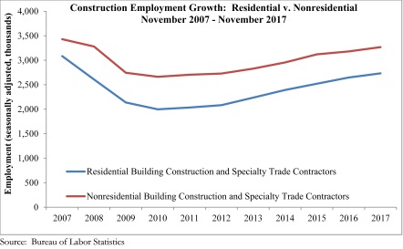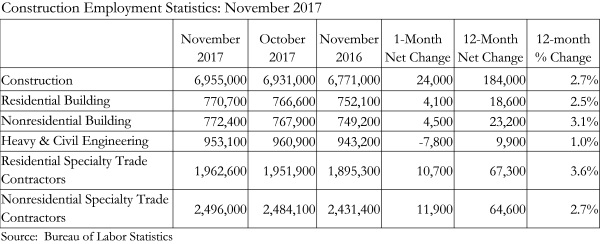 The construction industry unemployment rate increased by 0.5 percentage points and now stands at 5 percent. While this increase is likely due to seasonal factors, an increase in the construction industry unemployment rate is not necessarily a bad indicator given ongoing skilled labor shortages. The unemployment rate for all nonfarm industries—a figure that is seasonally adjusted—remained unchanged at 4.1 percent in November and remains at a 17-year low.