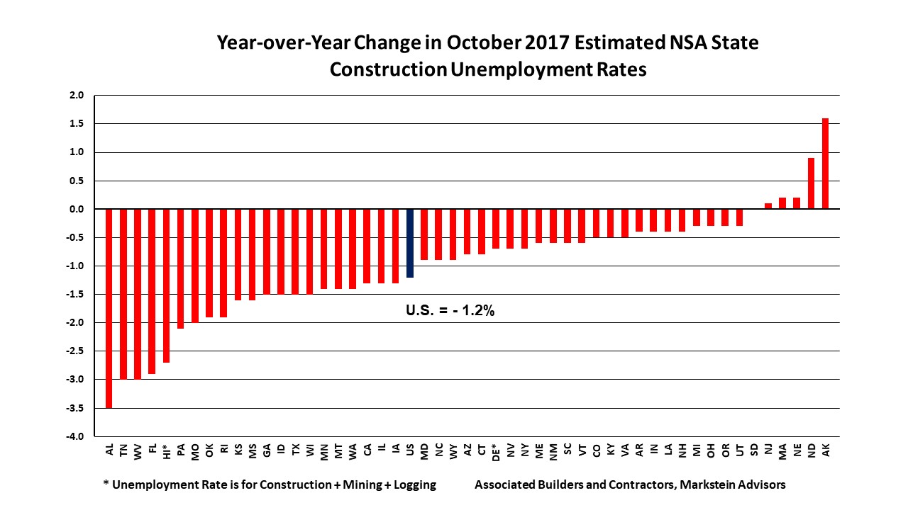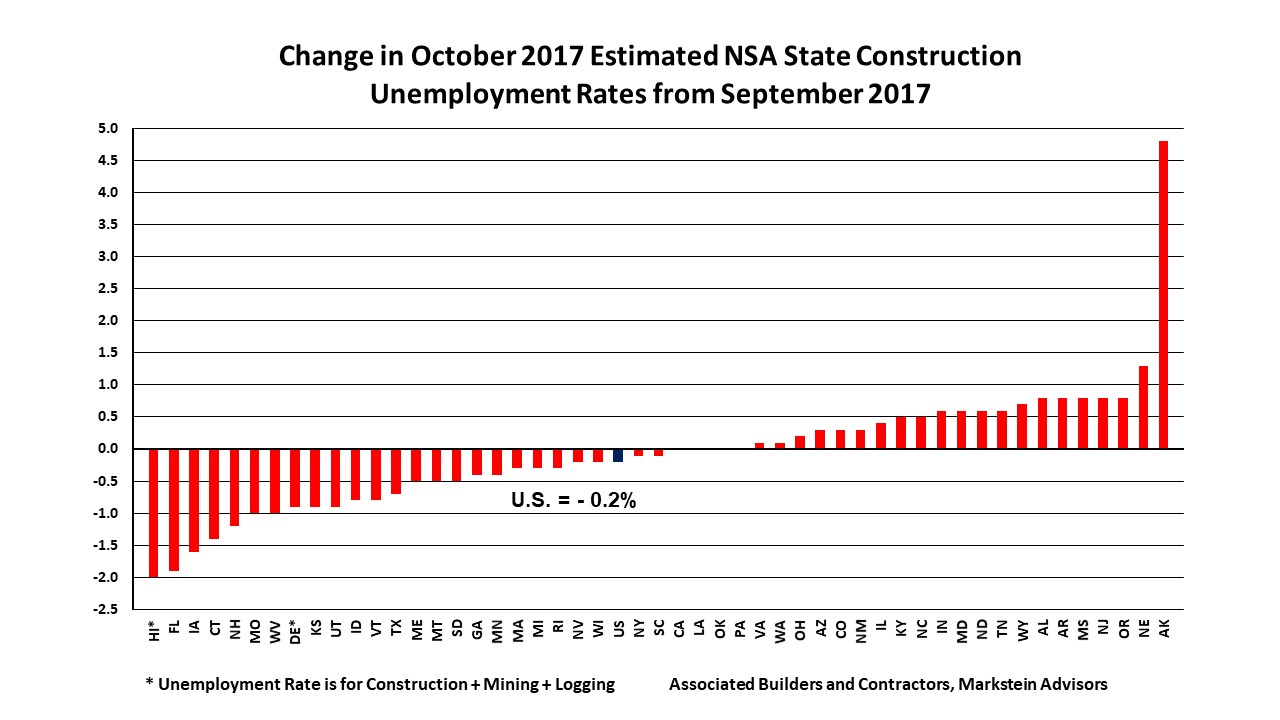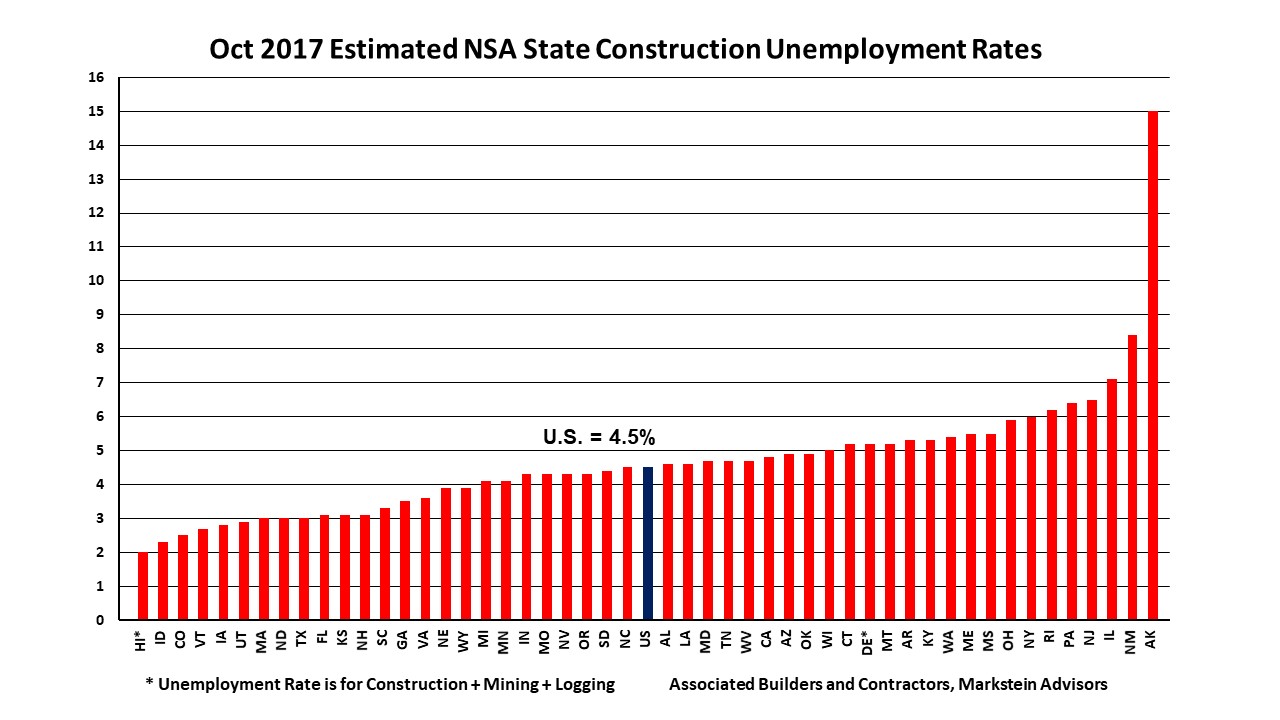 WASHINGTON, Nov. 28—The not seasonally adjusted (NSA) national construction unemployment rate was 4.5 percent in October, down 1.2 percent from a year ago, the U.S. Bureau of Labor Statistics (BLS) reported. It was the lowest October rate on record, matching the rate in 2006, according to analysis released today by Associated Builders and Contractors (ABC). Further, the construction industry employed 180,000 more workers than in October 2016. Construction unemployment rates were also down in 44 states on a year-over-year basis, unchanged in one (South Dakota) and up in five states. “Recovery from the various hurricanes that hit the United States appeared to be a major factor in October construction employment. Some northern states that would normally have an increase in their NSA construction unemployment rate had flat or down rates. This is likely due to some construction workers leaving those states to help with hurricane recovery,” said Bernard M. Markstein, Ph.D., president and chief economist of Markstein Advisors, who conducted the analysis for ABC. “The need for construction workers as part of recovery and rebuilding efforts after this year’s devastating hurricanes, floods and wildfires is providing employment for workers who normally would be subject to seasonal layoffs.” Because these industry-specific rates are not seasonally adjusted, national and state-level unemployment rates are best evaluated on a year-over-year basis. The monthly movement of the rates still provides valuable information, although extra care must be used in drawing conclusions from these monthly movements. From the beginning of the data series in 2000 through 2016, the monthly movement in the national NSA construction unemployment rate from September to October has recorded a decrease five times and an increase 12 times. This year, the rate was down 0.2 percent from September. Among the states, 25 had decreases in their October estimated rate from September, 21 were up and four (California, Louisiana, Oklahoma and Pennsylvania) had no change. The Top Five States The states with the lowest estimated October NSA construction unemployment rates in order from lowest to highest were: 1. Hawaii, 2 percent 2. Idaho, 2.3 percent 3. Colorado, 2.5 percent 4. Vermont, 2.7 percent 5. Iowa, 2.8 percent Hawaii’s number one ranking was a jump from 16th lowest in September, tied with Kansas and North Carolina. It was the state’s lowest October rate since the beginning of the estimates in 2000. Further, Hawaii had the largest monthly drop and the fifth largest year-over-year decline in its rate among the states. Note that Hawaii’s unemployment rate is a rate for construction, mining and logging combined. The data to estimate a construction unemployment rate alone are not available for either Hawaii or Delaware. Idaho and Colorado, which were in the top five in September, remained in the top five in October. This was Idaho’s lowest October estimated rate on record. Colorado slipped a few spots—it had September’s lowest construction unemployment rate. Nonetheless, this was the state’s second lowest October rate on record, after its 2.2 percent rate in 2000. Vermont’s fourth place ranking in October was up from the eighth lowest rate in September (tied with Oregon and Virginia). It was the state’s lowest October rate on record, matching its 2014 rate. Iowa made a big improvement in October. The state had the third largest drop in its rate from September, when it had the 22nd lowest rate. This was also its lowest estimated October rate on record. North Dakota, which ranked third lowest in September based on revised data (previously reported as the second lowest rate), tied with Massachusetts and Texas for seventh lowest, with a 3 percent October estimated NSA construction unemployment rate. Nebraska, which ranked second lowest in September based on revised data (previously reported as the third lowest rate), fell to the 16th lowest rate, tied with Wyoming. Wyoming had the fifth lowest rate in September. The Bottom Five States The states with the highest October NSA construction unemployment rates in order from lowest to highest were: 46. Pennsylvania, 6.4 percent 47. New Jersey, 6.5 percent 48. Illinois, 7.1 percent 49. New Mexico, 8.4 percent 50. Alaska, 15 percent Three of these states—Alaska, Illinois and New Mexico—were also among the five states with the highest construction unemployment rates in September. Alaska had the highest rate in the nation for the third month in a row. The state also had the largest monthly increase, up 4.8 percent from September, and the largest year-over-year increase, up 1.6 percent. For the third consecutive month, New Mexico had the second highest rate in the country. It was also the eighth month in a row that the state has had either the highest or second highest construction unemployment rate in the nation. Illinois had the third highest estimated NSA construction unemployment rate in October, the same as in September (based on revised data; previously reported as the fourth highest rate). Still, it was the state’s lowest October construction unemployment rate since the 4.7 percent rate in 2006. New Jersey fell six spots from its September ranking, when it had a 5.7 percent rate (tied with Montana, Ohio and West Virginia). The state’s 6.5 percent construction unemployment rate was its second lowest October rate after last year’s 6.4 percent rate. There was only slight movement for Pennsylvania, as it dropped one spot from September’s ranking. Nonetheless, this was the state’s lowest October rate since 2006’s 4.4 percent rate. Connecticut, which had the fourth highest rate in September (based on revised data, previously reported as the third highest rate), improved to the 14th highest rate in October with a 5.2 percent rate, tied with Delaware and Montana. It was the state’s lowest estimated NSA construction unemployment rate since the 4.7 per