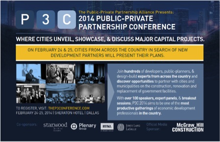 Join ABC and a growing list of industry peers, Feb. 24-25, 2014, in Dallas for the annual Public-Private Partnership Conference. Hundreds of developers, public-planners and A/C/E experts from across the country will be in attendance to discover opportunities to partner with cities, states and local agencies.