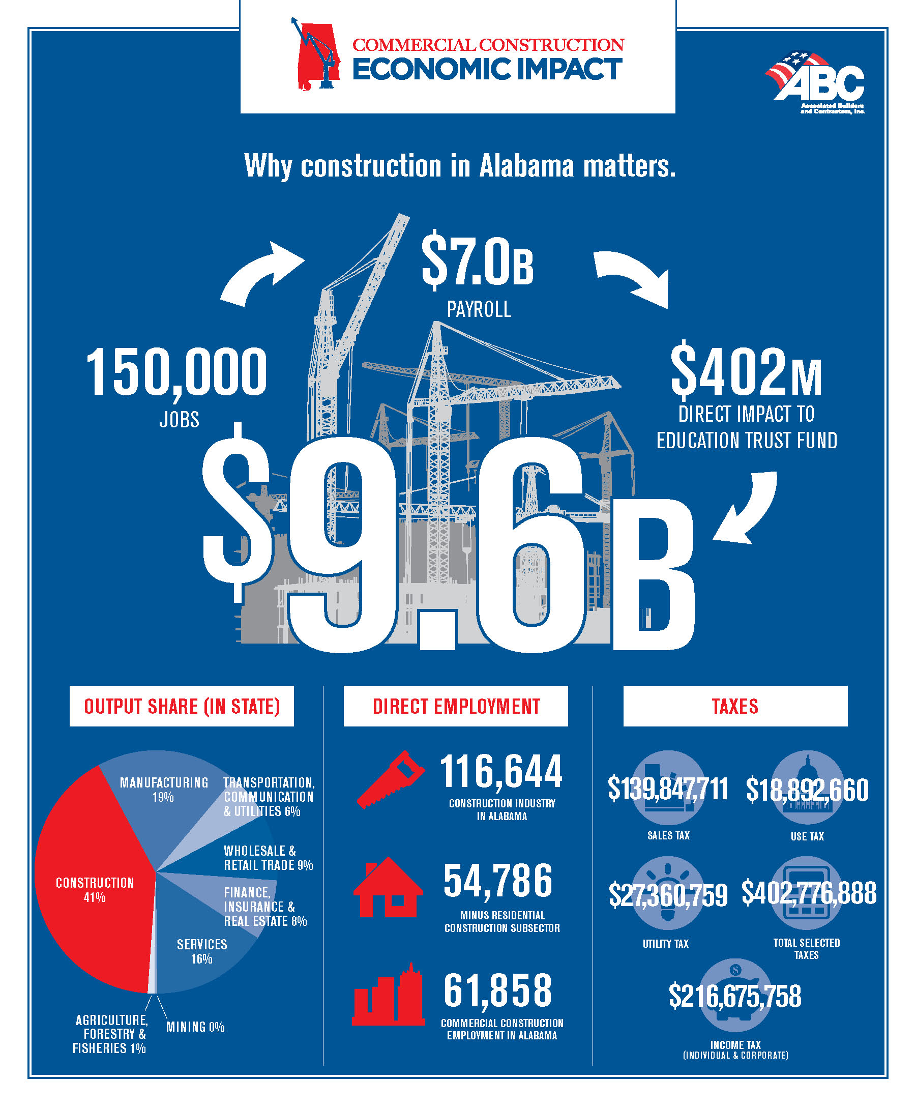 An economic study organized by the Associated Builders and Contractors (ABC) Alabama chapter found commercial construction’s economic impact exceeds $9.6 billion, making it the largest industry in the state. Dr. Keivan Deravi, economics professor for Auburn University at Montgomery, took a detailed look into the construction industry in Alabama, reaching beyond construction billing and analyzing the overall impact, including related industries such as concrete, paper, lumber and wood, to find comprehensive data on the effect construction has on the state. Following are key findings: