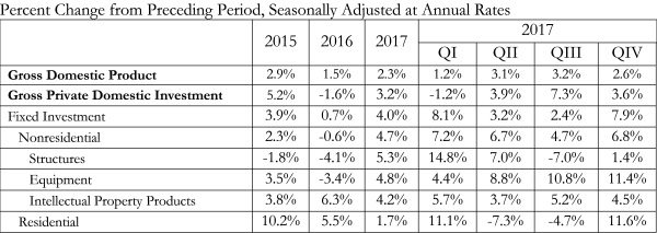 The year-end figure for GDP growth of 2.3 percent is up from 1.5 percent in 2016 but down from the 2.9 percent figure posted in 2015. Nonresidential fixed investment increased 4.7 percent in 2017, its best year since increasing 6.9 percent in 2014. This followed a 0.6 percent contraction in 2016.