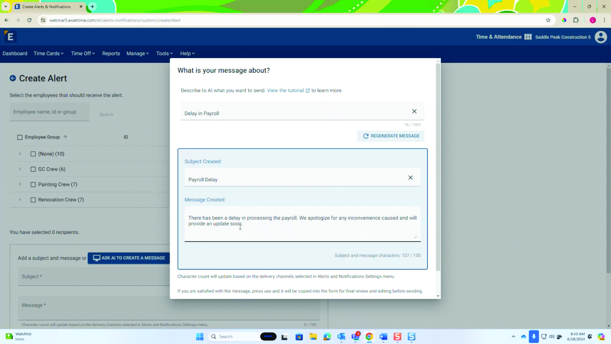 Here at Arcoro, the first step has been incorporating ChatGPT functionality into the time tracking and workforce management tool ExakTime to help administrators quickly and easily create customized notifications for their workers.