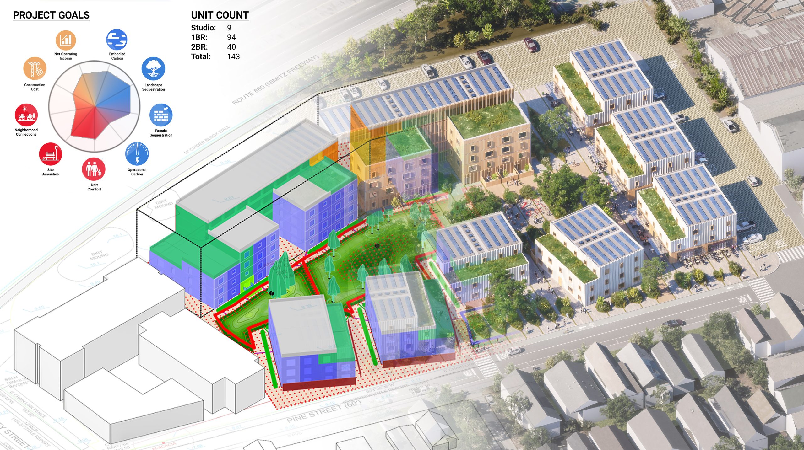 Autodesk AI tools, designers and builders worked together to rapidly explore a huge range of housing options that met complex project goals. Adding a floor to a building, nudging the structure’s position north or south, shifting a playground or greenspace from the edge of the development to the center: Each move impacts the project’s goals around cost, carbon and livability.