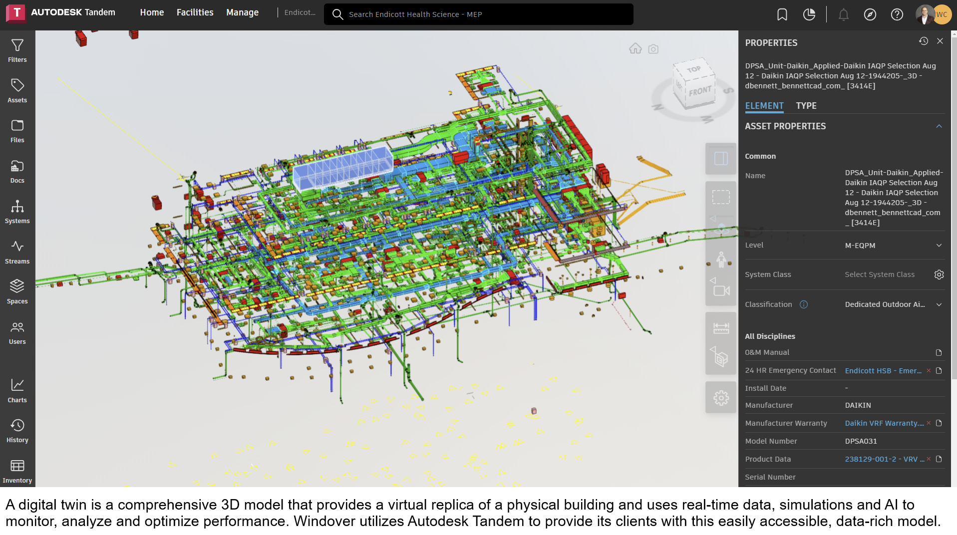 Windover knew its clients could be using this data for facility management, but the information was lost in the documentation they were providing. Windover sought a solution that would extend its technology to its clients, ideally incorporating BIM data without requiring expertise in specific software. Windover began employing digital twin technology using Autodesk’s Tandem software to take fully coordinated models developed during construction and provide clients with an accurate replica of their building that could also hold facility management data like warranties, installation dates, service schedules, manufacturer information and much more. Taking it a step further, Windover has also incorporated IoT sensors, building BIM and AI-driven analytics to provide real- time insights into building performance.