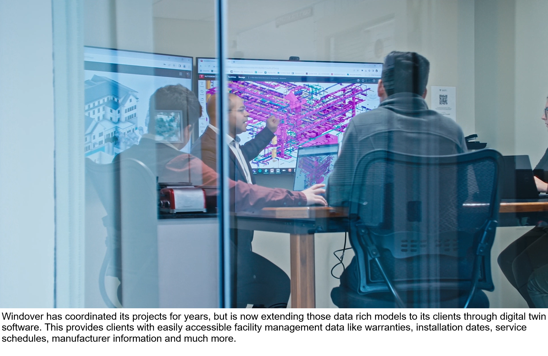 hand over cumbersome manuals and PDF drawings at the end of a project, leaving most clients with unhelpful documentation for facility management, Windover has employed cutting-edge technology to provide clients with easily accessible data. As a standard practice, Windover’s virtual, design and construction team coordinates all projects throughout the design and build phases. However, they realized that all the valuable data created during the BIM coordination process was lost when the project was handed over to the client.