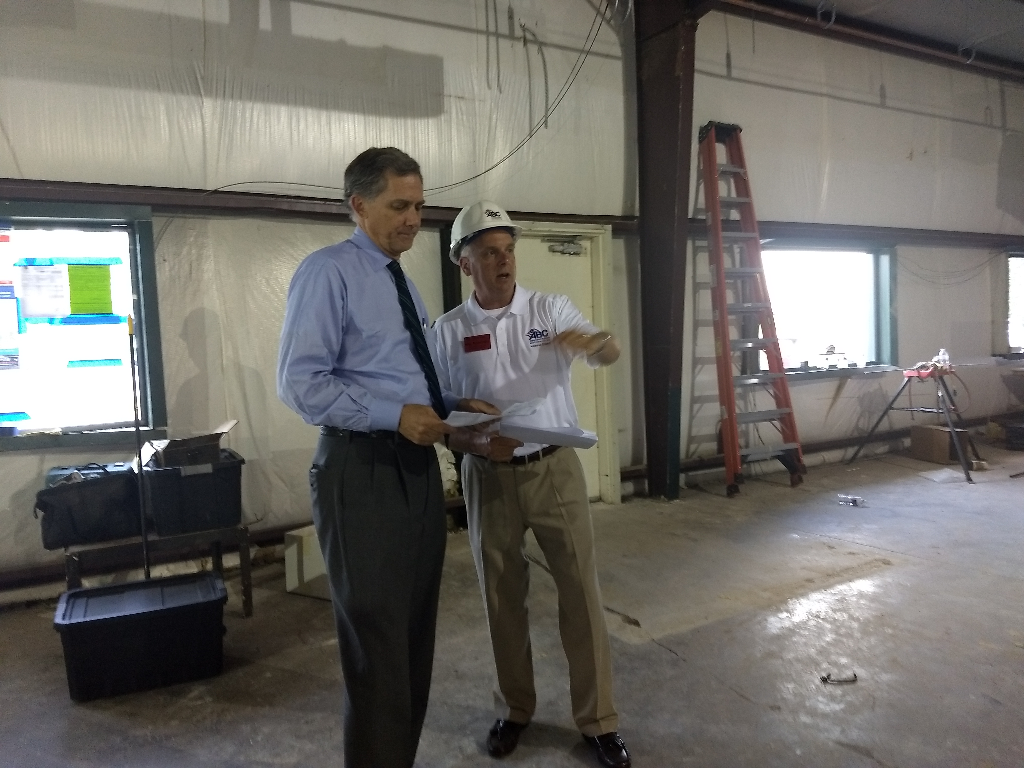 Bill Roachell showing US Congressman French Hill the plans for the new front office building—where classrooms and a conference center will be located.